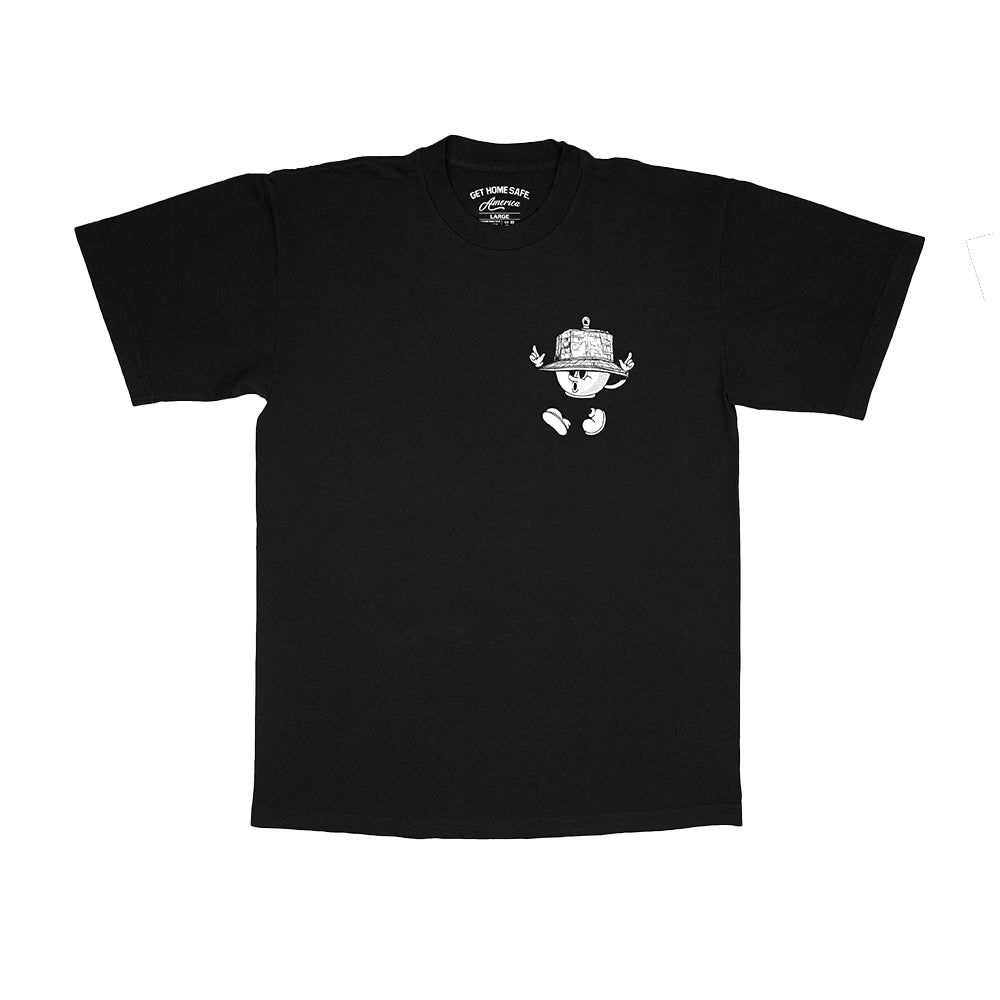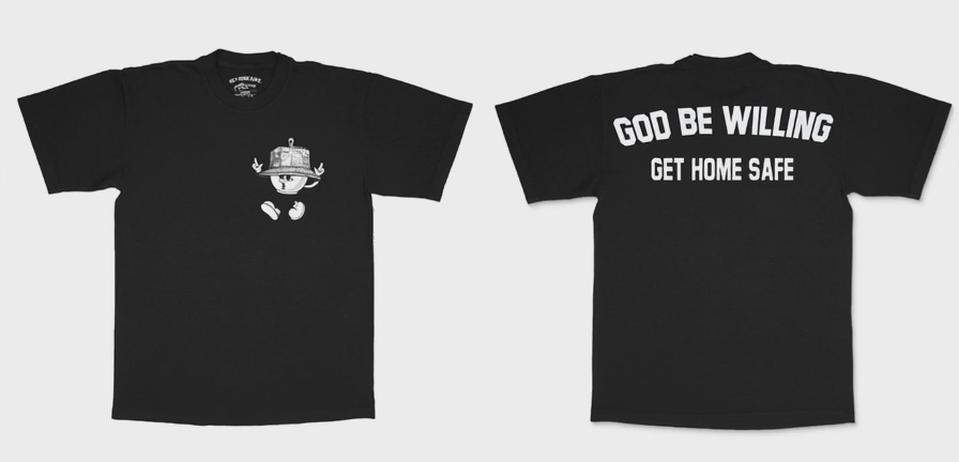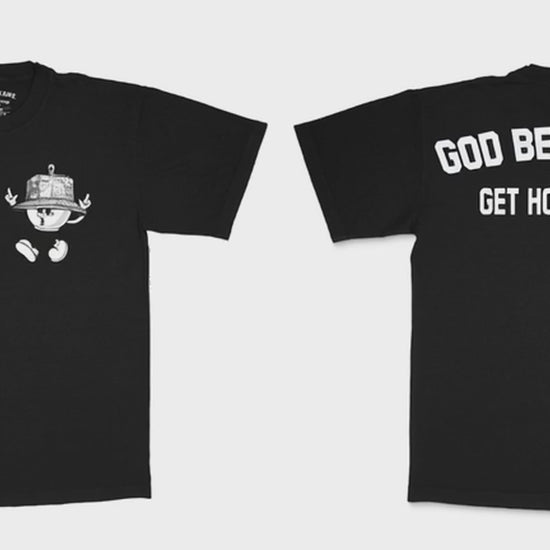 The “Bray Bray God Be Willing” tee from Get Home Safe America features the brand’s signature Bray Bray character on the front left chest, rocking a detailed bucket hat and bold attitude. On the back, large varsity-style text declares “GOD BE WILLING” above the iconic “GET HOME SAFE.” mantra—blending faith, purpose, and street culture into a powerful everyday statement.