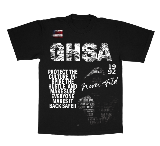 The Never Fold Tee from Get Home Safe America is a bold declaration of resilience, unity, and purpose. On the front, the powerful “GHSA” stamp sits above the core mission: Protect the culture, inspire the hustle, and make sure everyone makes it back safe. A subtle silhouette layered with “Get Home Safe” text and the phrase Never Fold reinforces the message of strength and accountability.